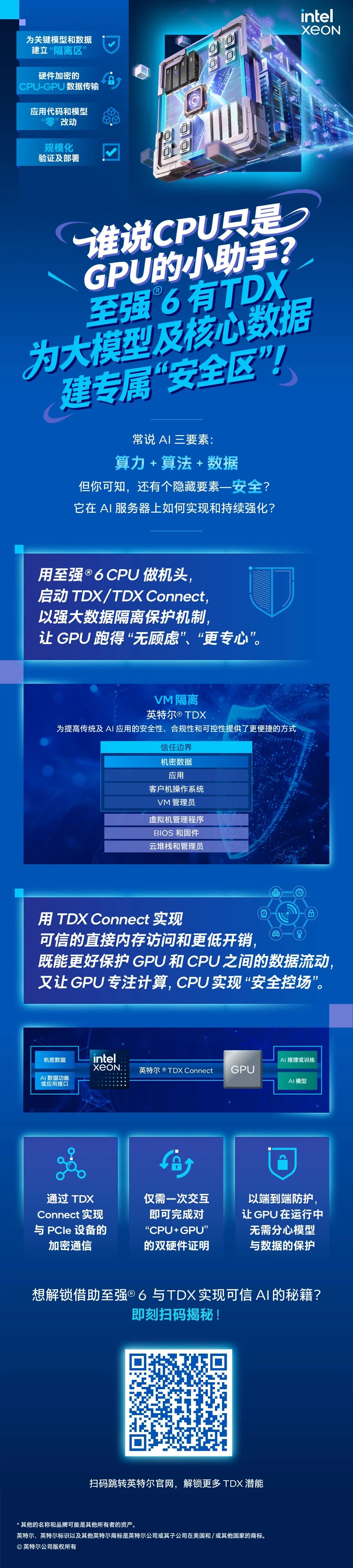 这就要回到英特尔不断强调的基于硬件、集成在CPU里的可信计算或可信AI技术了。它的TDX(Trust Domain Extensions)技术,核心使命就一个:让CPU担起安全控场的角色,让GPU专心做计算,两者结合实现互补,成就既高效又更为可信的AI能力。